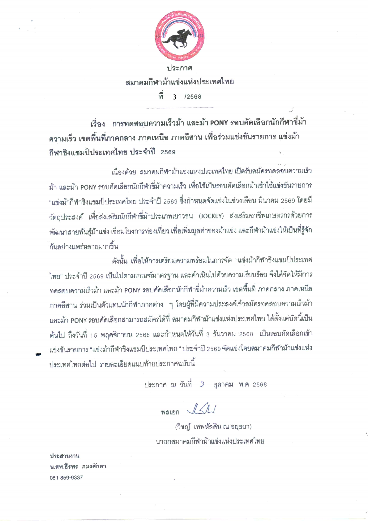ประกาศ เรื่อง การทดสอบความเร็วม้า และม้า PONY รอบคัดเลือกนักกีฬาขี่ม้าความเร็ว เขตพื้นที่่กลาง ภาคเหนือ ภาคอีสาน เพื่อร่วมแข่งขันรายการ แข่งม้า กีฬาชิงแชมป์ประเทศไทย ประจำปี 2569